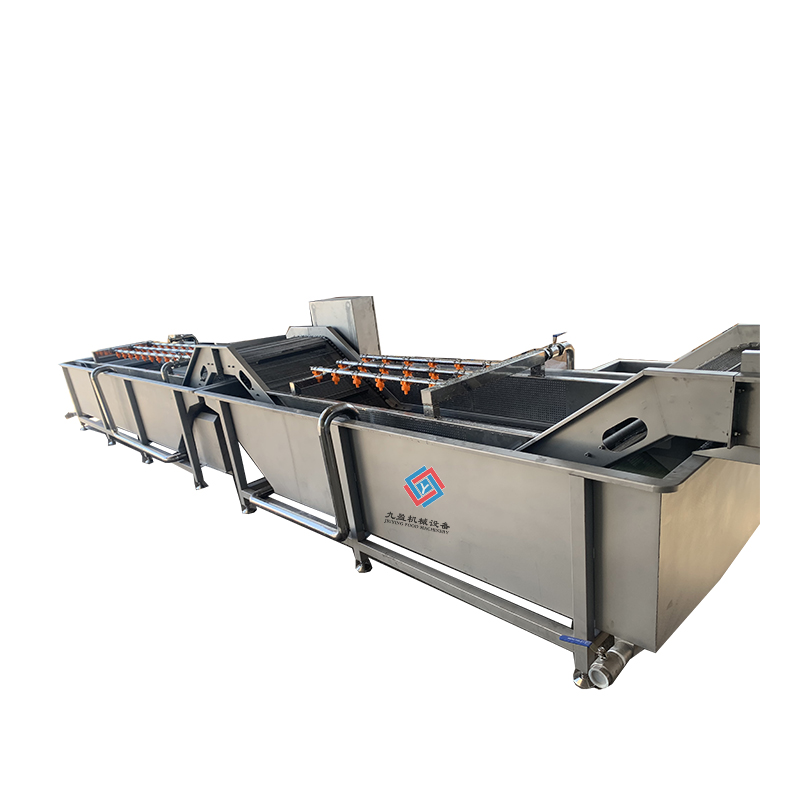 蔬菜清洗加工生產(chǎn)線/流水線的加工流程一般為:先將不可使用的部分取出進(jìn)行分揀,經(jīng)過人工分揀之后將物料通過輸送帶輸送至下一道工序,通過氣泡清洗機對蔬菜進(jìn)行清洗,物料會隨著水流輸送出,經(jīng)過二次噴淋后能提高清洗的效果。